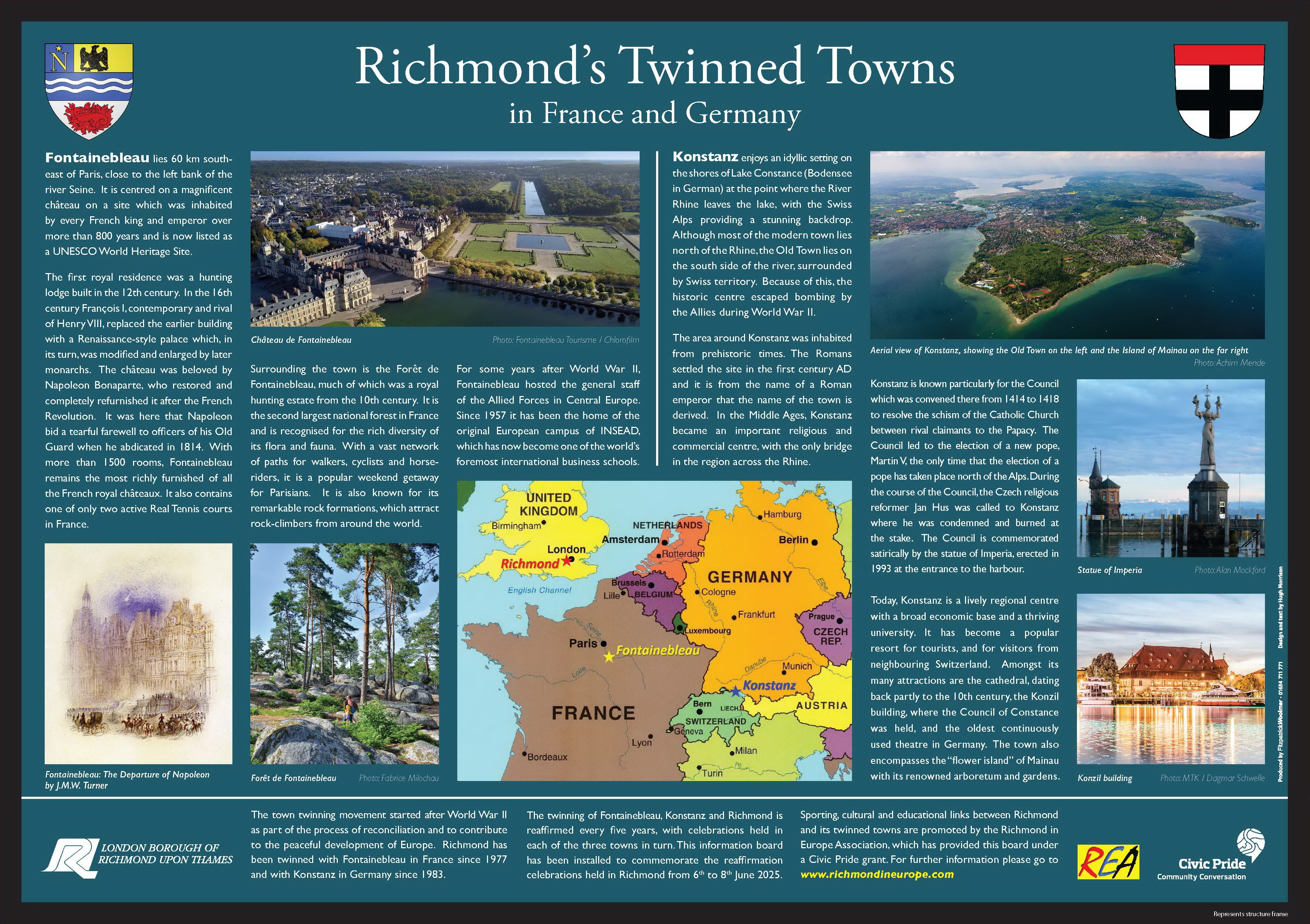 In addition three new information boards about our twin towns of Fontainebleau & Konstanz have been installed in Richmond, Twickenham & East Sheen & an attractive new fingerpost sign has been erected outside the civic centre in Twickenham.