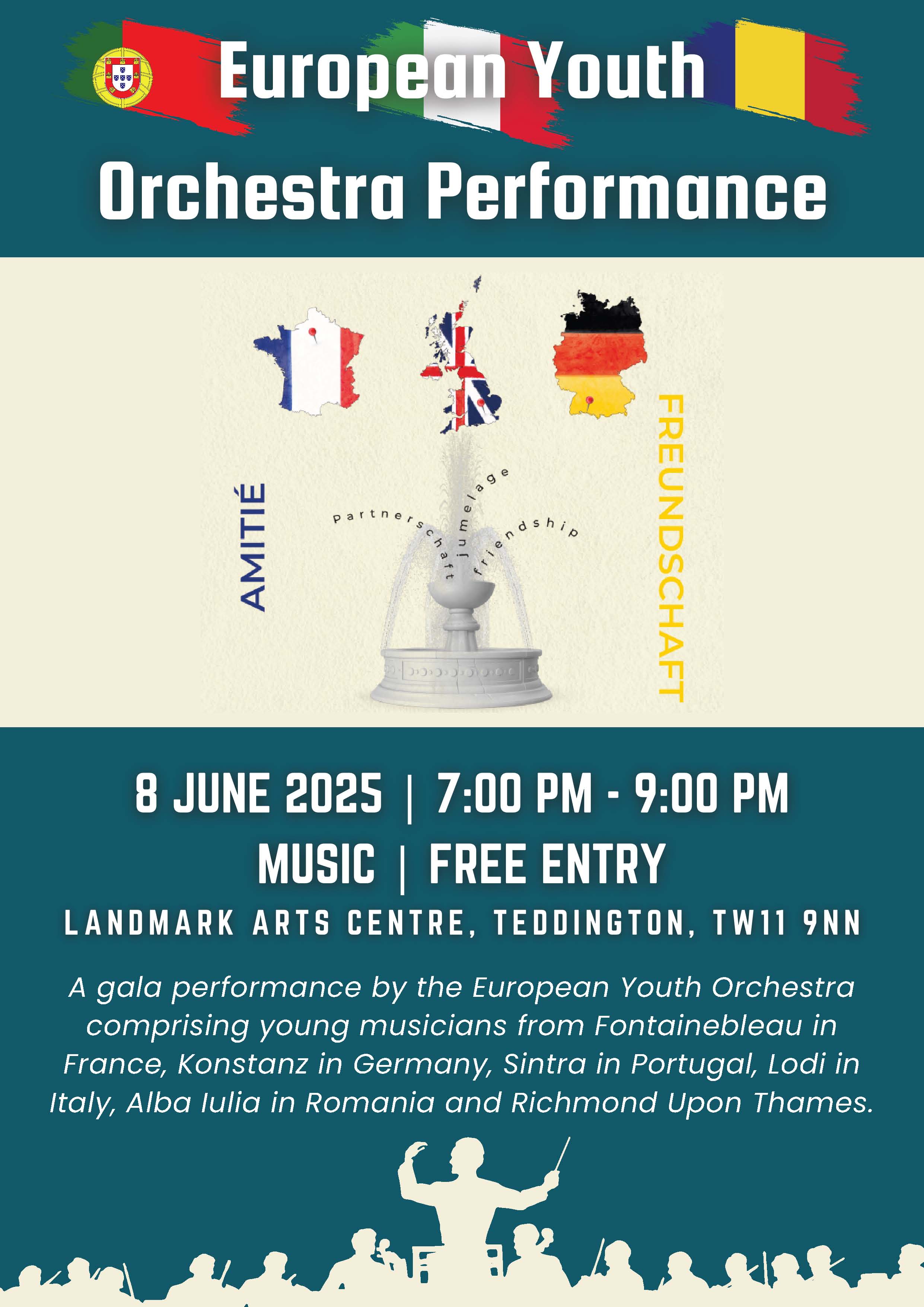 7 p.m. A performance by the outstanding European Youth Orchestra, comprising 100 musicians from Richmond, Fontainebleau, Konstanz, Lodi, in Italy, Sintra in Portugal and Alba Iulia, in Romania, at the Landmark Arts Centre in Teddington. The youth of Europe united by music.