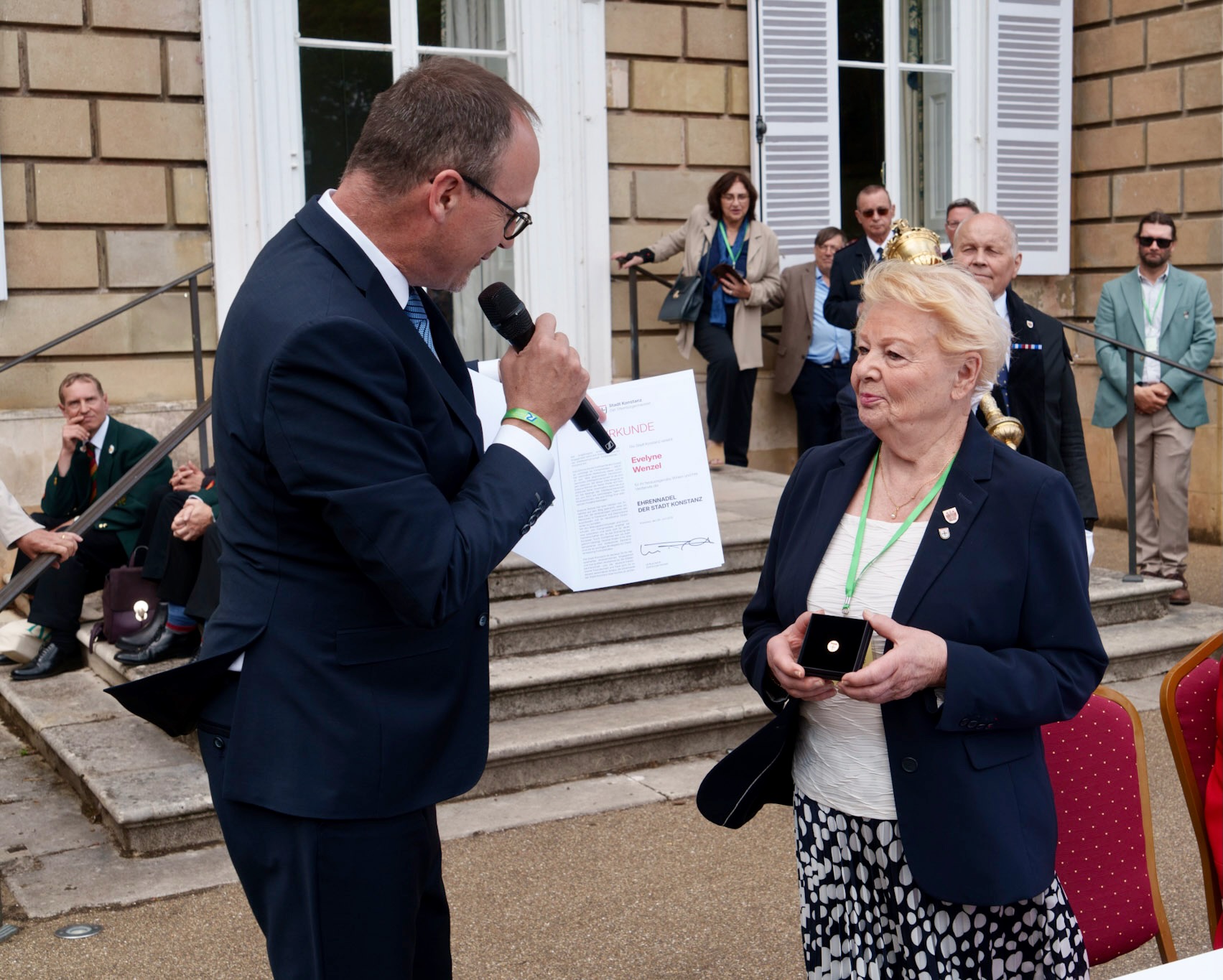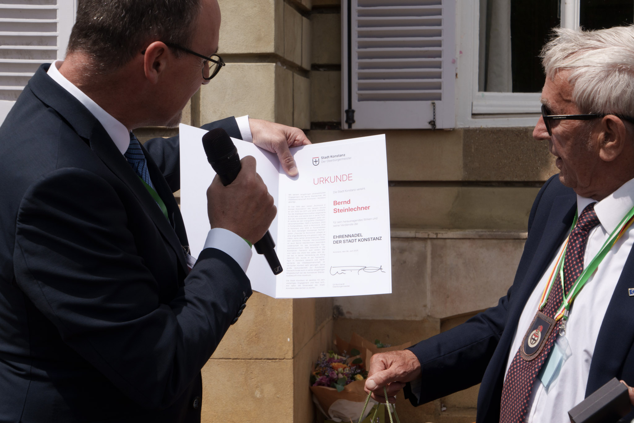 The Oberbürgermeister of Konstanz then awarded former REA Chairman, Bernd Steinlechner, ARCIF President, Evelyne Wenzel & REA Chairman, Alan Mockford with golden Ehrennadeln (Badges of honour) in recognition of their work in promoting their towns’ partnerships with Konstanz over many years.
