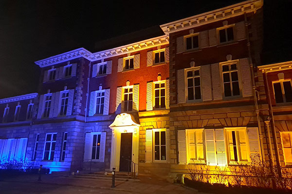 6th June 2025. York House illuminated in the colours of the French & UK flags this evening to commemorate the Reaffirmation. It will be illuminated in the colours of the German flag on Saturday evening. Please note the emblems of the three European towns hanging from the windows.