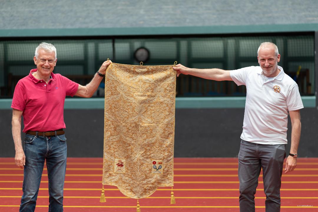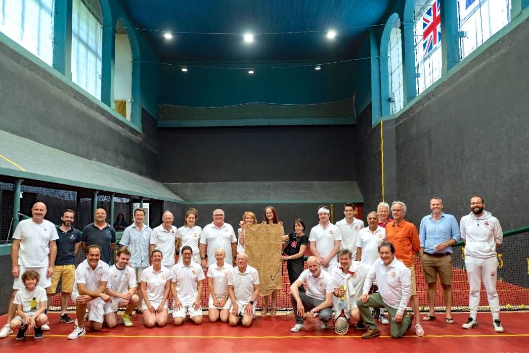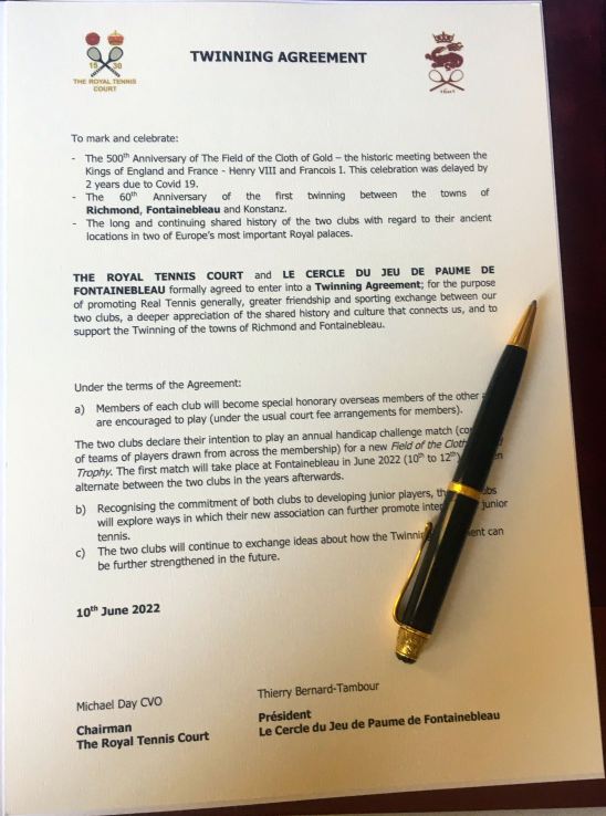10th-12th June 2022. The Royal Tennis Court, Hampton Court, & le Cercle du Jeu de Paume de Fontainebleau formalised their partnership at the château de Fontainebleau. The two clubs were competing for the inaugural Trophée du Drap d’Or, which had originally been scheduled for 2020 to commemorate the 500th anniversary of the Field of Cloth of Gold meeting between King Henry VIII & François I and the 60th anniversary of the first twinning between Fontainebleau & Konstanz, which should also have been celebrated in this year. However the pandemic led to a postponement.