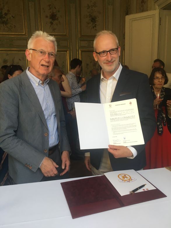 Michael Day, (on the left), the Chairman of the Royal Tennis Court & Thierry Bernard-Tambour, the President of the Cercle du Jeu de Paume signed the twinning agreement in the historic “Salon des Fleurs” of the château.