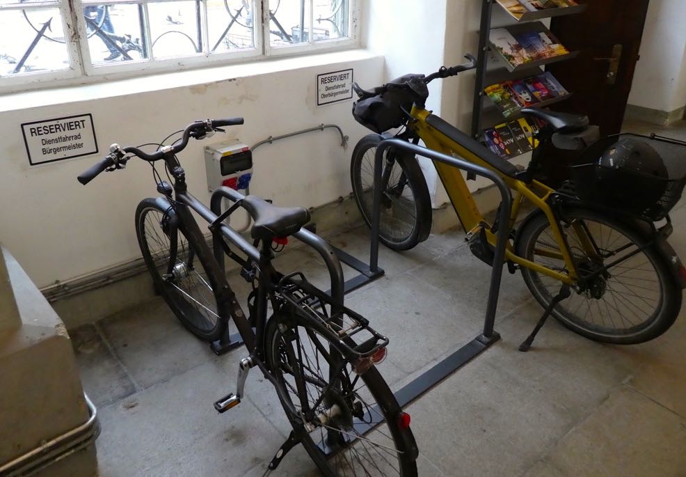 Leading by example. The spaces reserved in the town hall for the official bicycles of the Oberbürgermeister & Bürgermeister.
