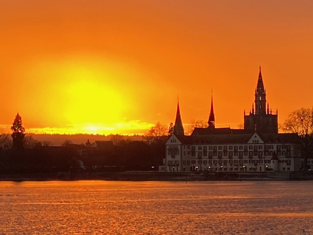 Sunset over the Münster.Deutsch wird immer englischer! Noticed in a shop in Konstanz.Alan with, Gisela Kusche, the leader of the Green Party on Konstanz Council.There is an hourly service by Katamaran from Konstanz to Friedrichshafen.Das Theater mit beschränkter Hoffnung, das einen Partner in Richmond sucht.Alan with retired Feuermann, Peter Renker & his wife Monika. The Konstanz Feuerwehr was the first organisation to form a partnership with Fontainebleau.