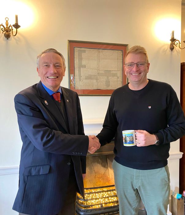 Here he is pictured in the Rathaus with Martin Schröpel & Toni Langemann from the partnership department, each holding one of our 2025 commemorative mugs, which are in daily use in the town hall.
