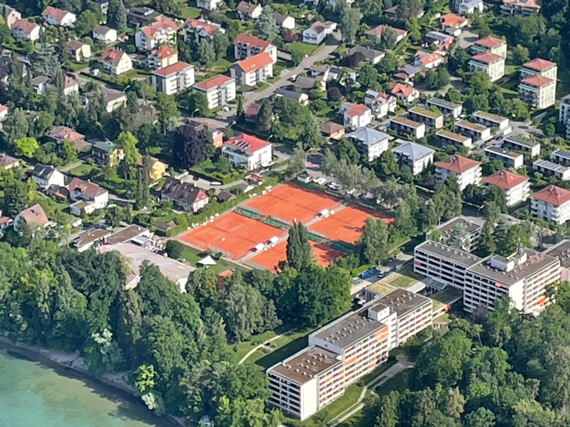 Konstanz Tennis Club as seen from a Zeppelin. The Tennishalle is situated between the ten outdoor clay courts & the lake.