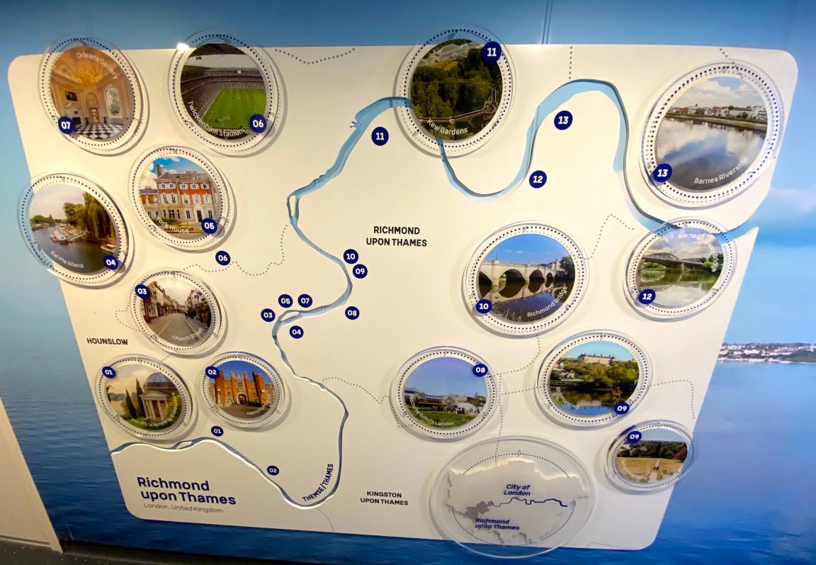 In the corridor on the lower deck a huge map of Richmond, also depicting some of the many highlights, fills the wall. Richmond is the only London borough which is situated on both sides of the Thames.