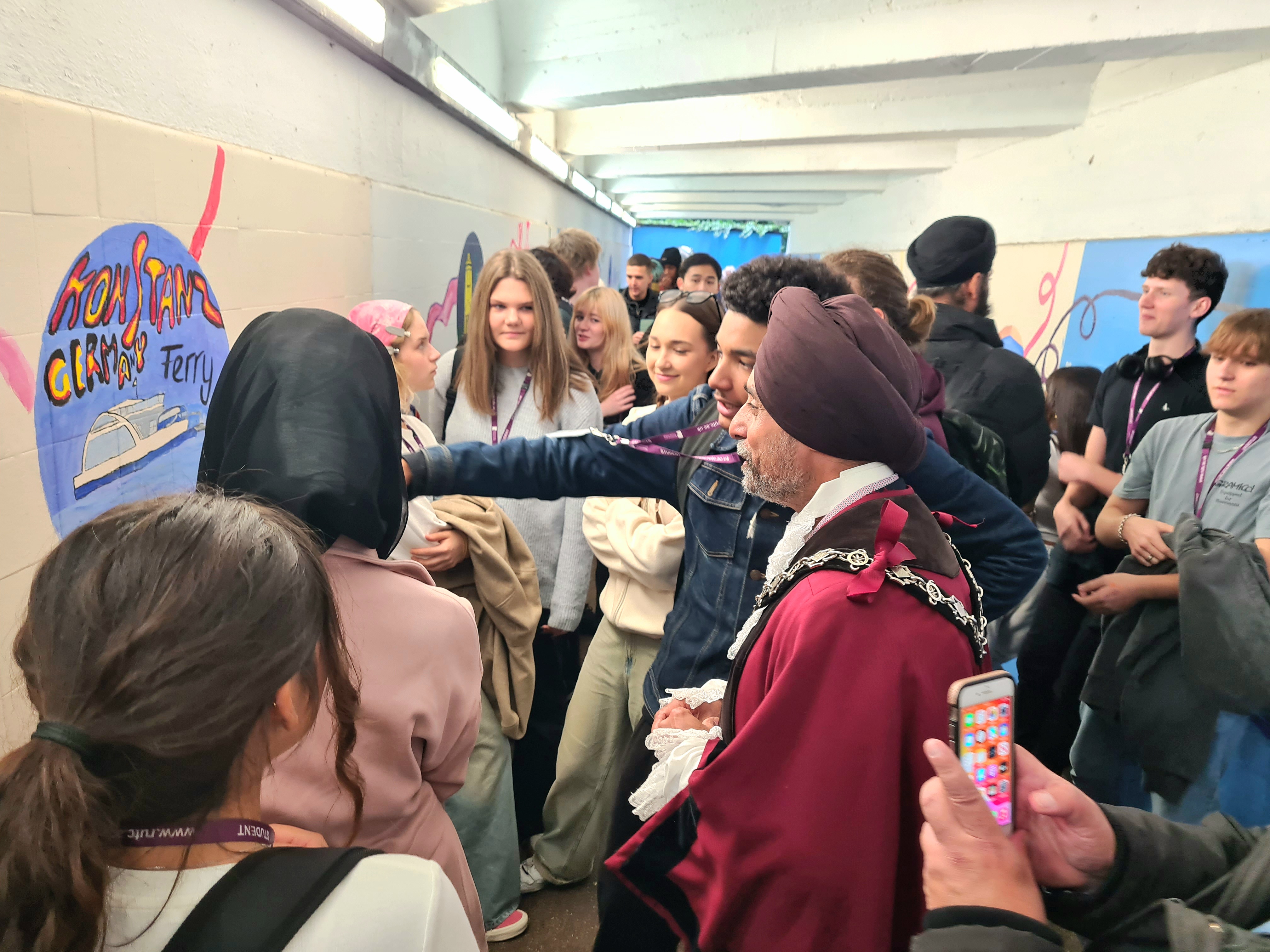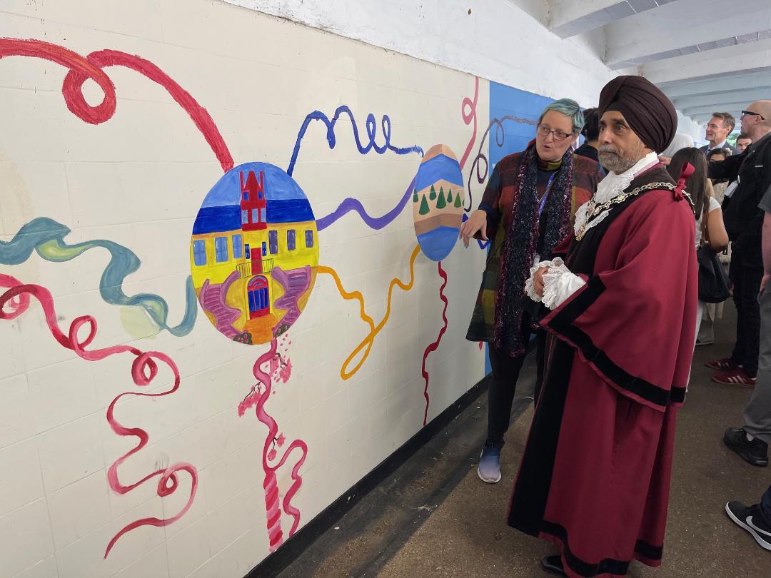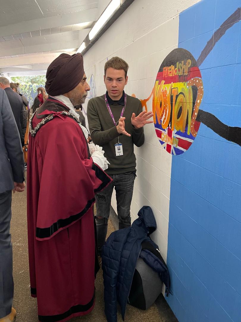 2nd October 2024. The Deputy Mayor of Richmond, Cllr. Kuldev Sehra, was delighted to be invited to open the new Twinning Underpass in Whitton, which had been decorated with pictures of our twin towns of Fontainebleau & Konstanz by local art students from Richmond College.