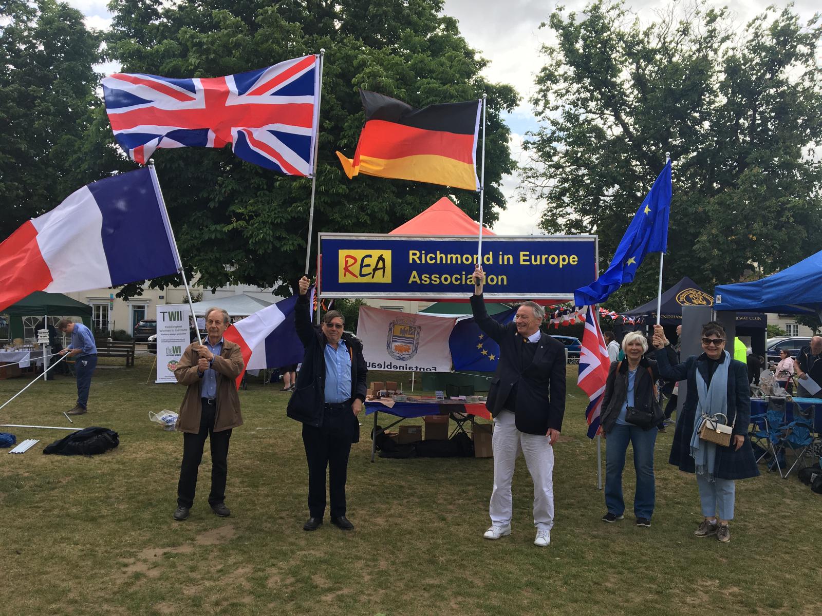 Richmond Town CentreRichmond Reference LibraryThe bunting on Richmond RiversideStein’s on Richmond Riverside, where we shall be welcoming our friends from Fontainebleau & Konstanz on the evening of Friday 6th June. All are welcome.REA members on Twickeham Green say, “Willkommen in Richmond. Bienvenue à Richmond.”St. Mary’s Church in Twickenham, where an ecumenical service will be held on Sunday 8th June before the parade.St. Mary’s Clay Court Tennis Club which is twinned with Konstanz Tennis Club.Whitton High Street. Photo: Pradeep Chitra Nehru