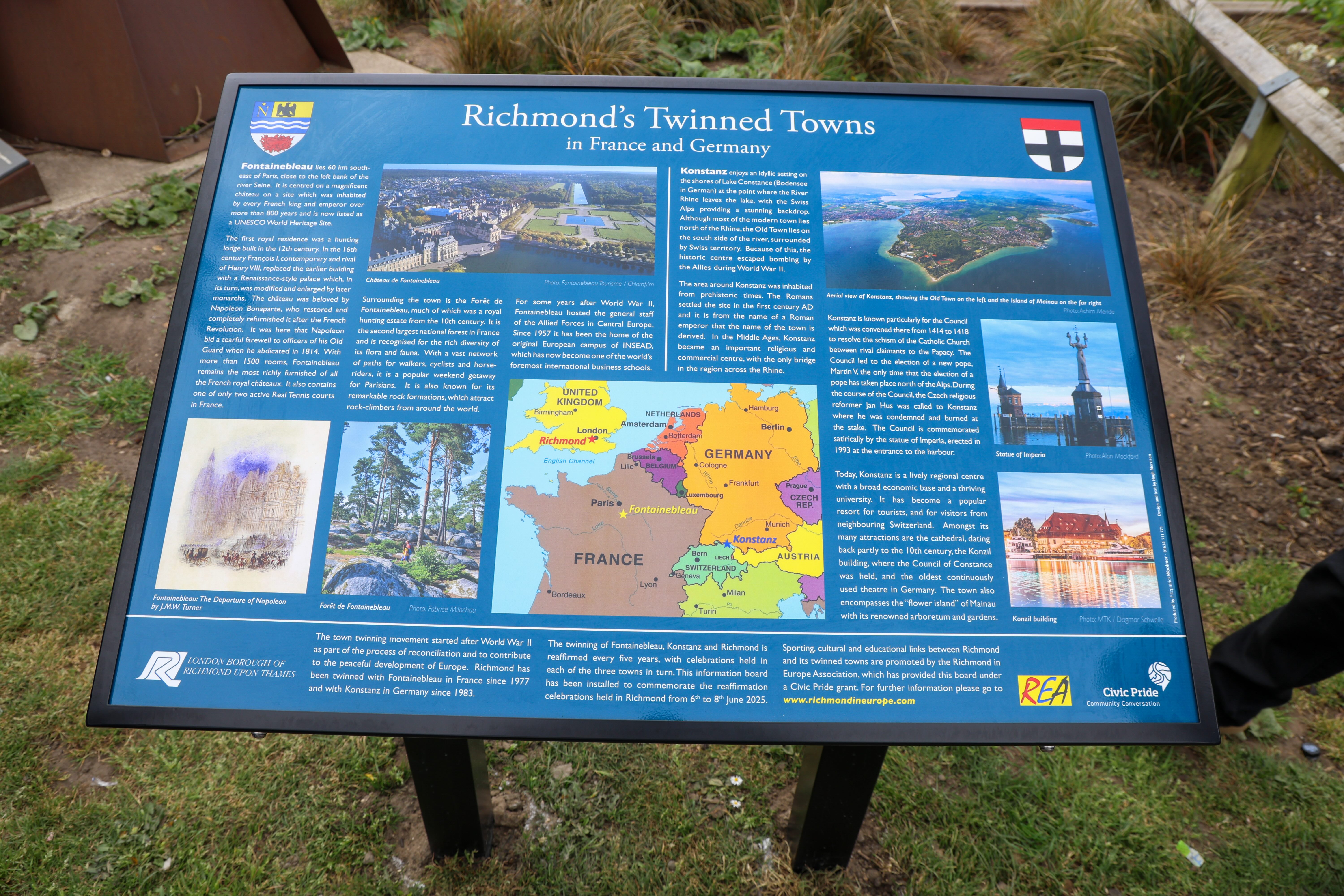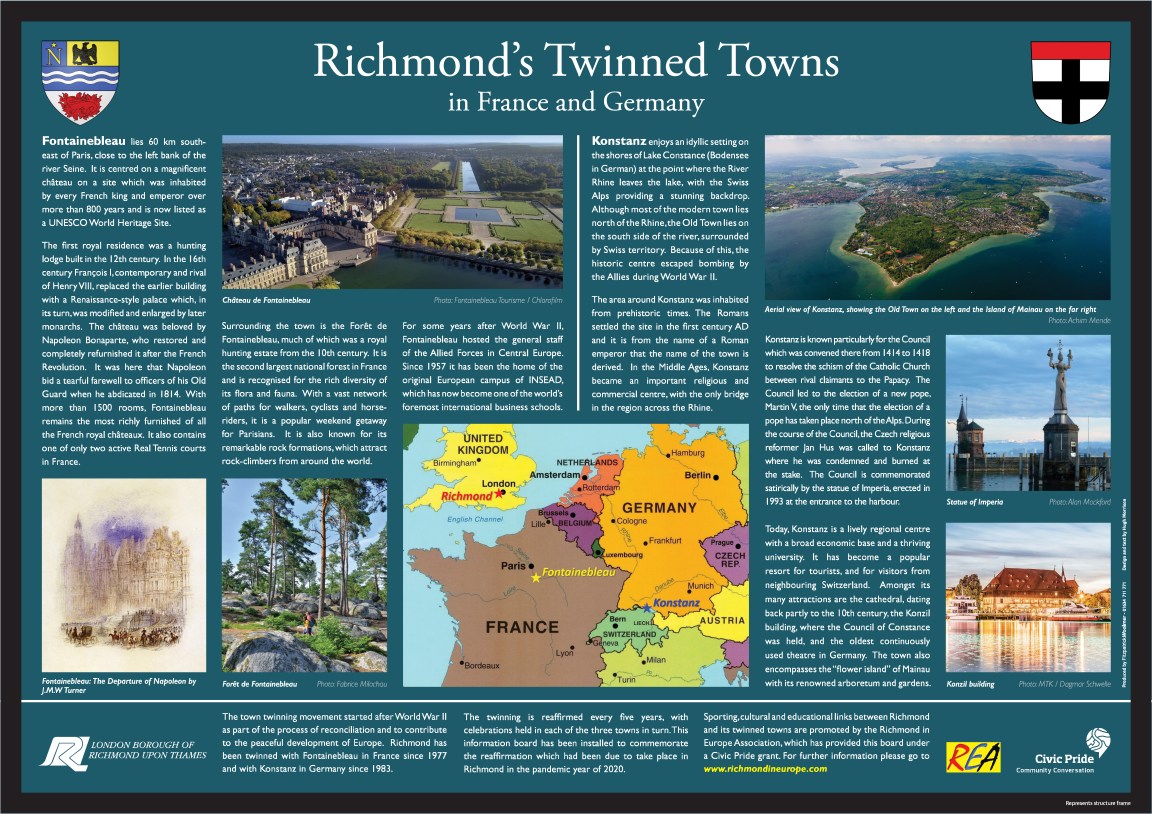 The other four Twinning Information Boards can be found in Kneller Gardens, outside East Sheen Library, in Orleans House garden & in the Terrace Garden by Richmond riverside.