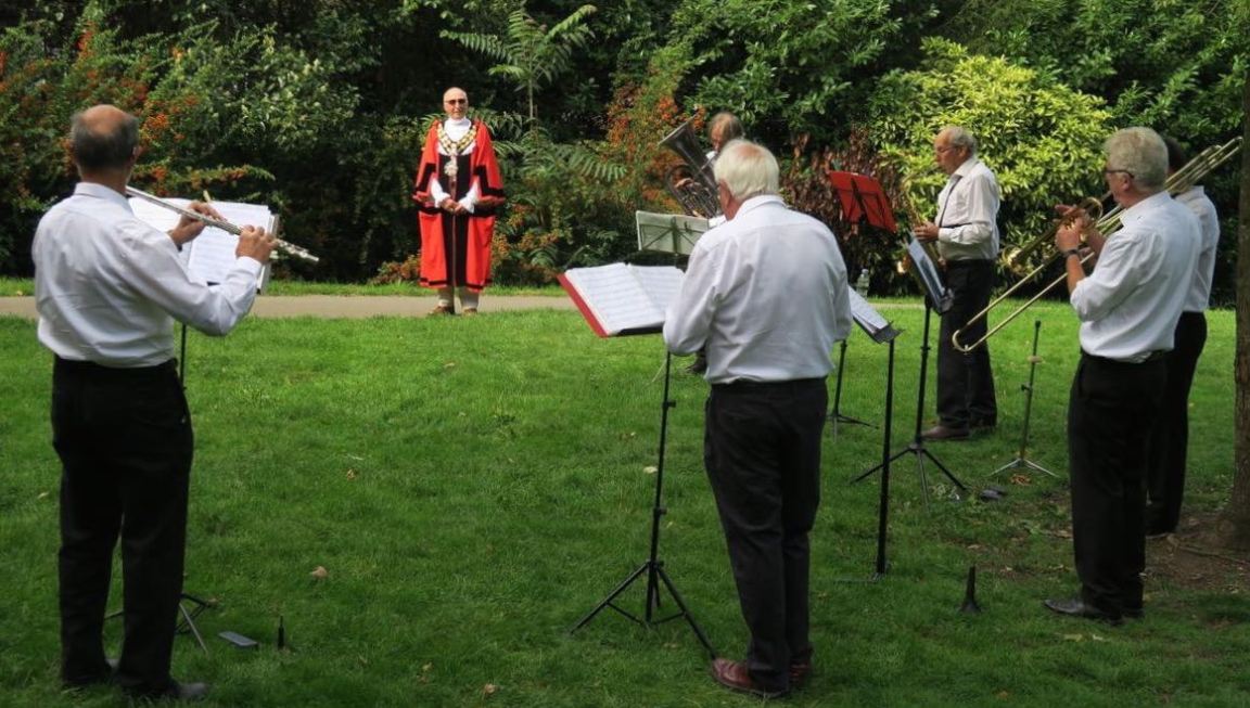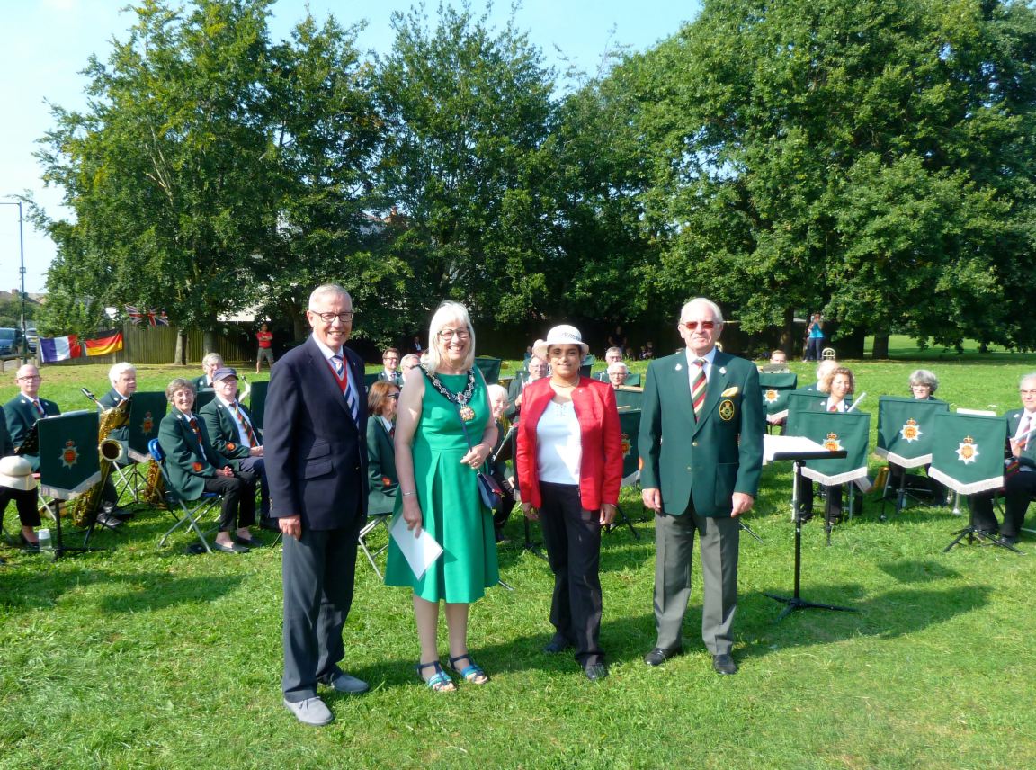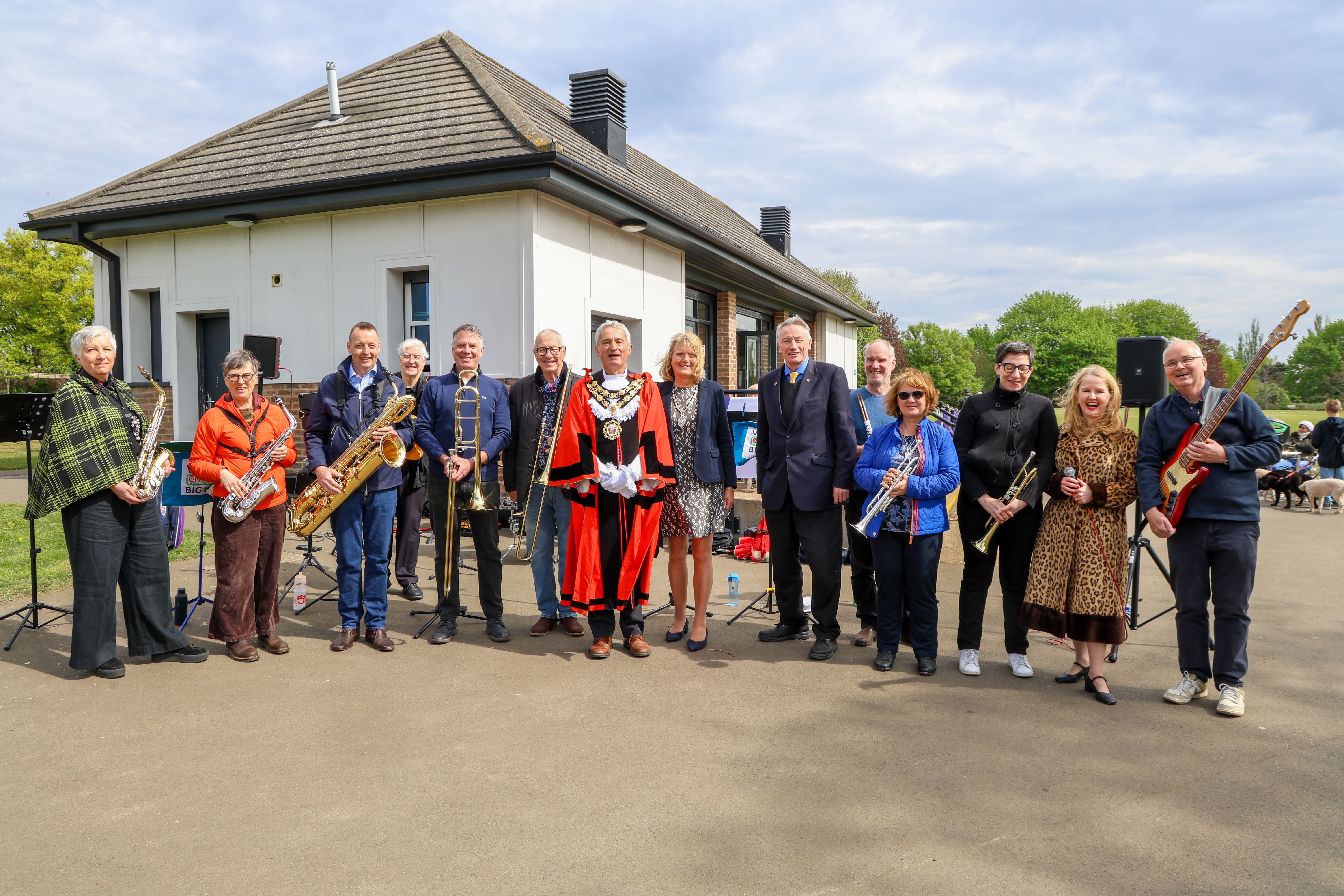 The sun finally appeared for a group picture of the Mayor with the Whitton Community Big Band.