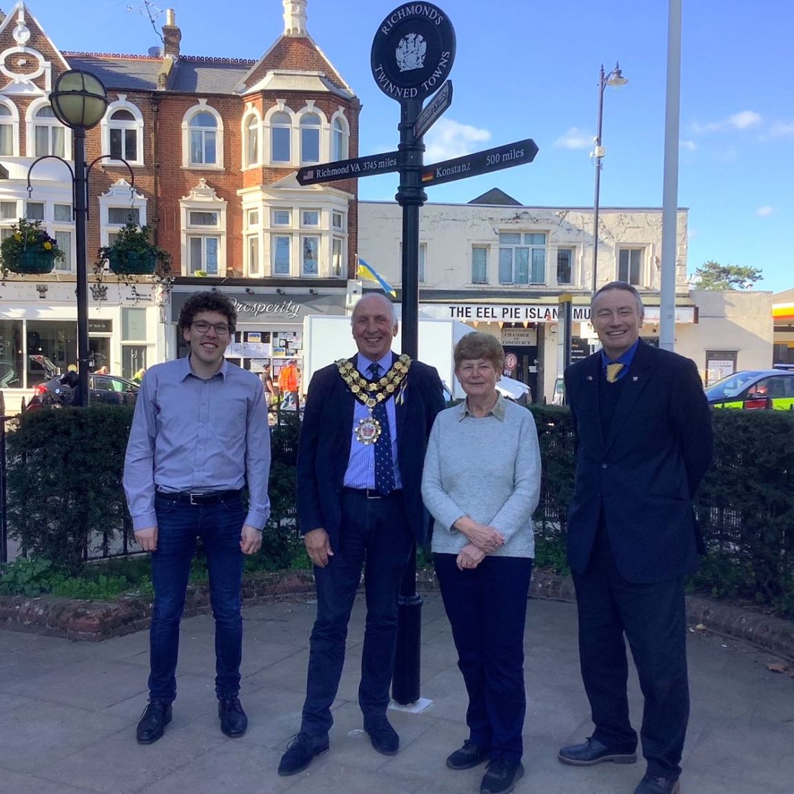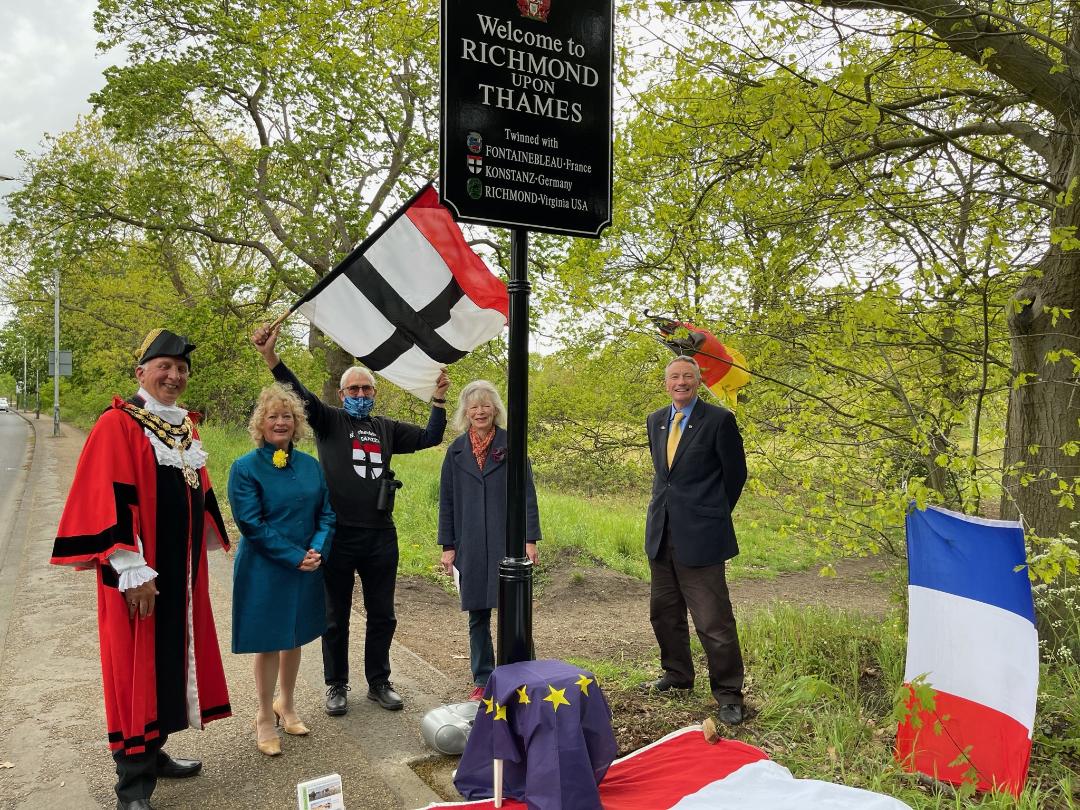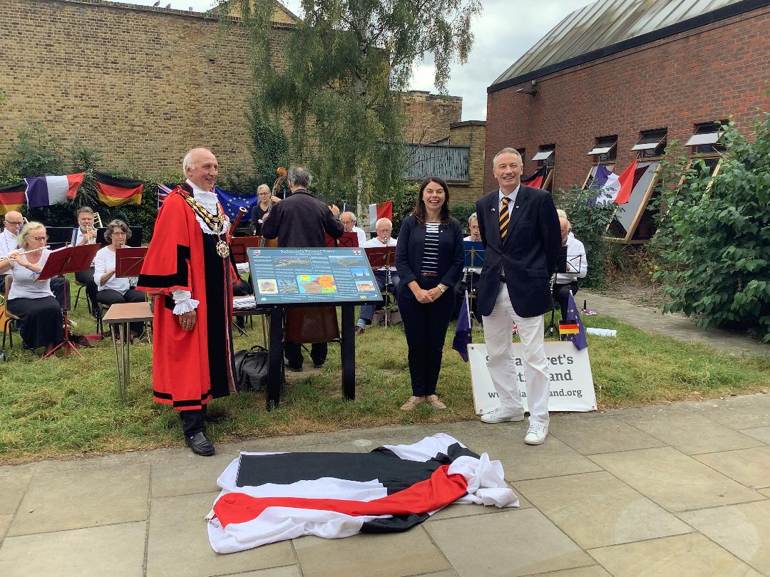 In glorious spring sunshine our English patron, the Mayor of Richmond, Cllr. Richard Pyne, unveiled the fifth Twinning Information Board in Ham Parade.