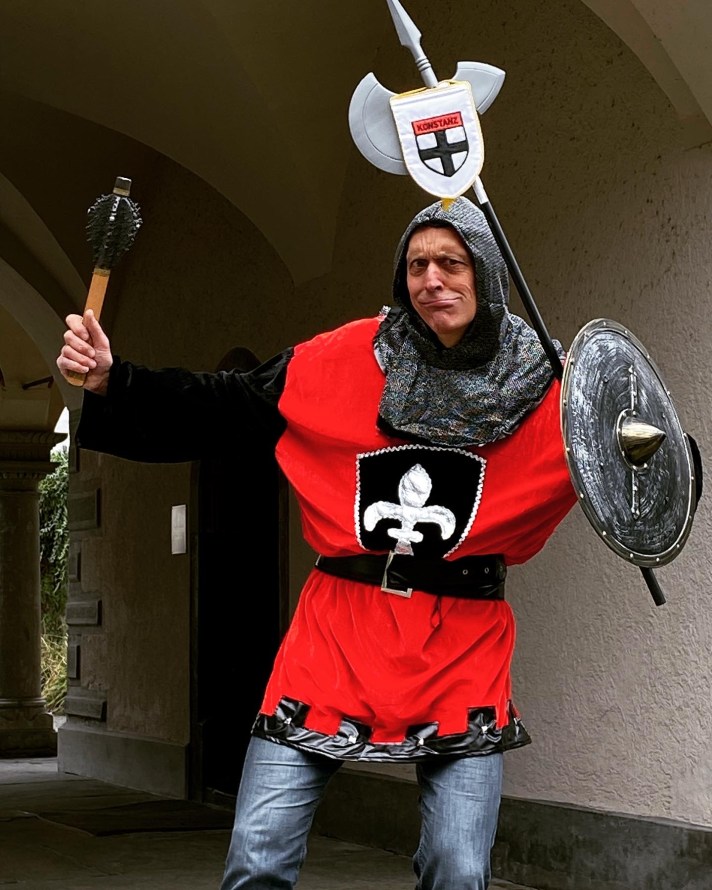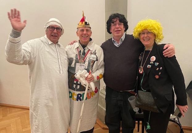 “In Konstanz cross border friendships are traditionally celebrated, especially during Fasnacht. During the foolish season Bernd Steinlechner from Richmond is a regular guest. He was spotted yesterday at the Fish Market with Renate & Francis Hodsman from England who are now residents in Konstanz. Renate was an au-pair in London when she met Francis at his 21st birthday party and fell in love with him. They got married & lived in England. After Francis’ retirement they moved to Renate’s home town of Konstanz.”