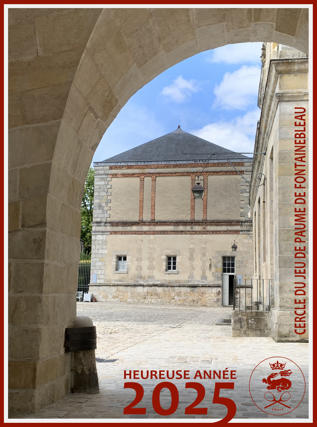 January 2025. We were delighted to receive this new year greeting from le Cercle du Jeu de Paume de Fontainebleau which is twinned with the Royal Tennis Court at Hampton Court Palace.