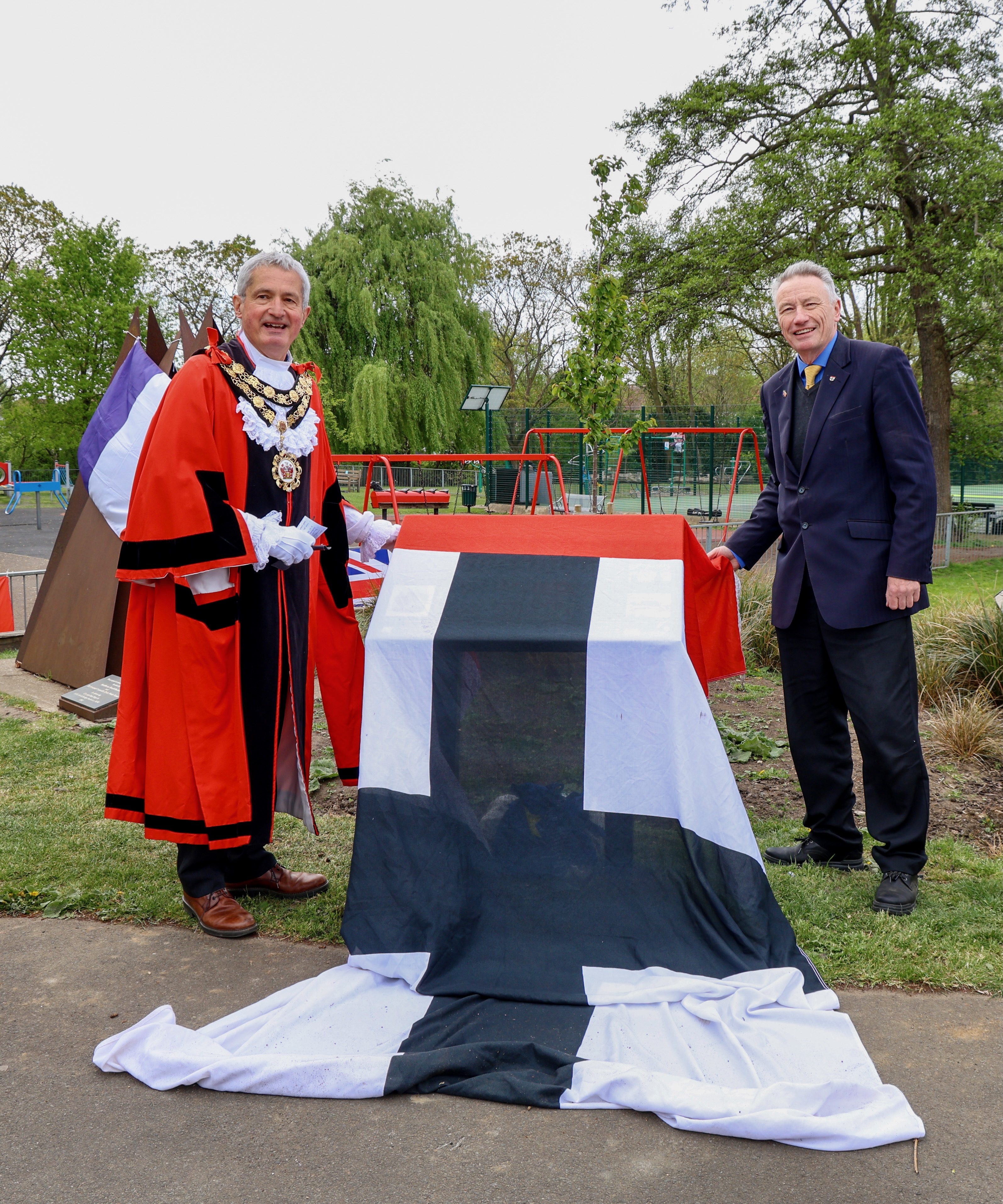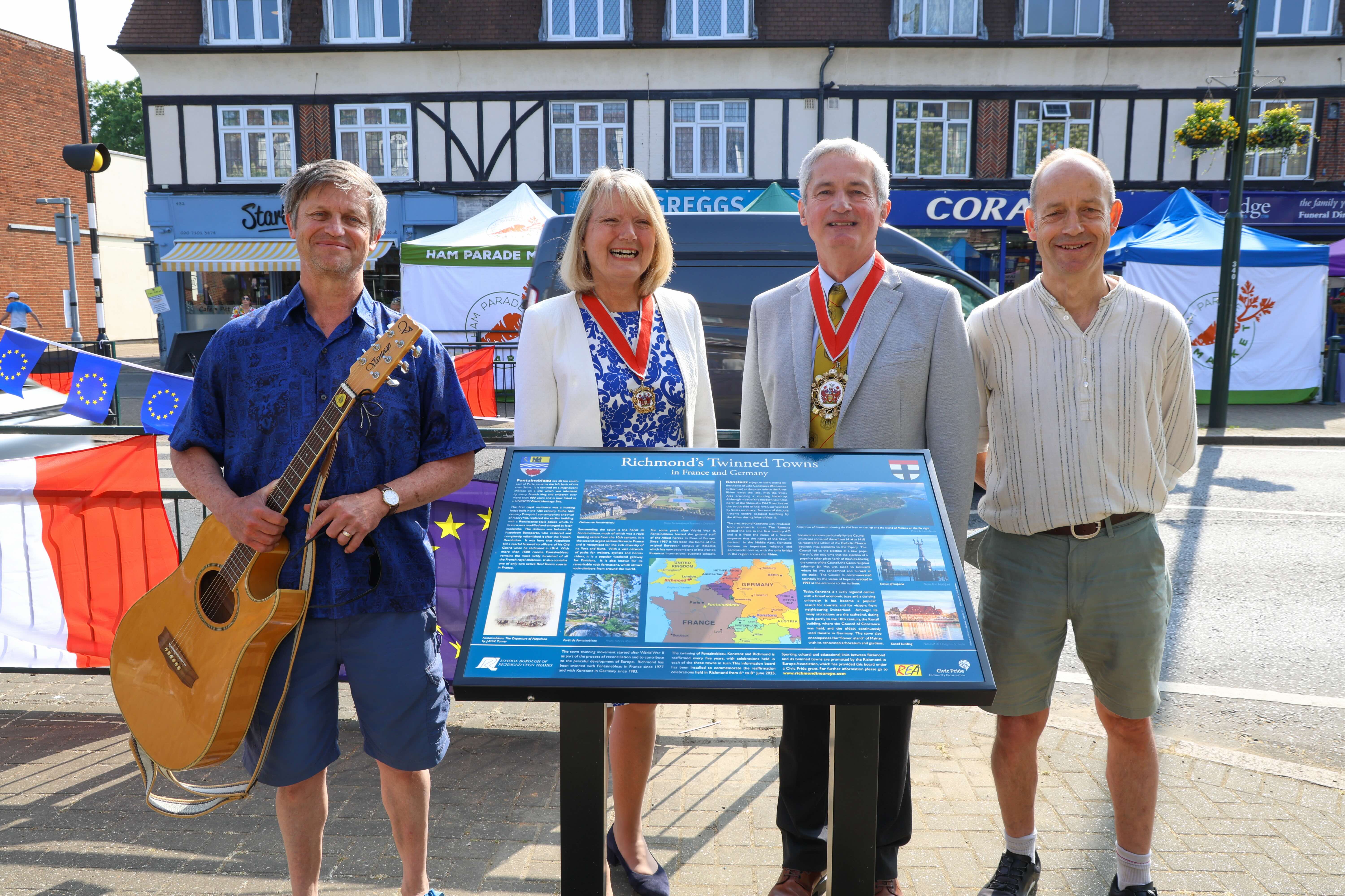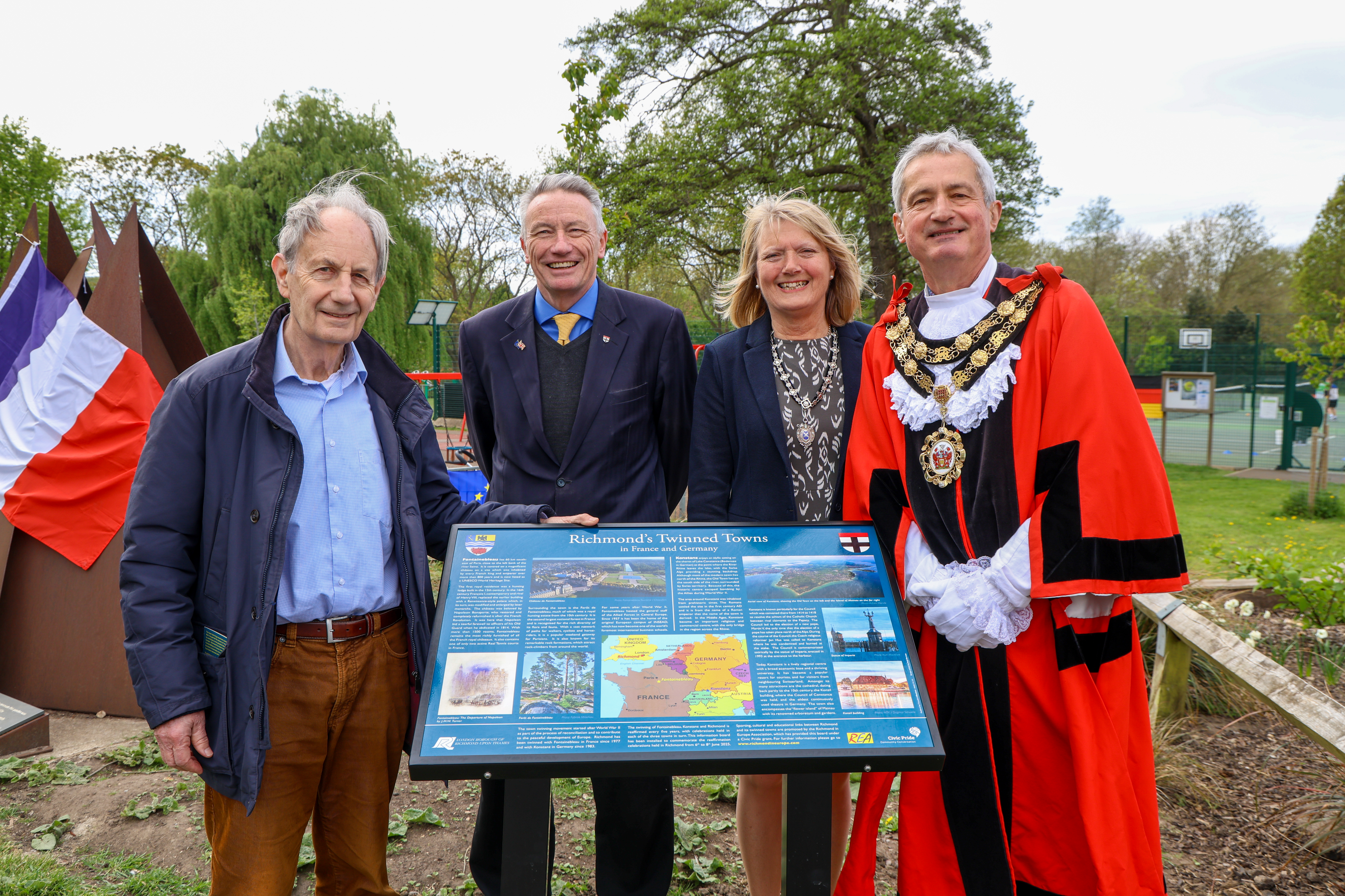 Saturday 19th April 2025. The Mayor of Richmond & REA’s English Patron, Councillor Richard Pyne, and REA Chairman, Alan Mockford, unveiled another Town Twinning Information Board. This one is in Kneller Gardens in Twickenham & it will complement the art students’ murals of Fontainebleau & Konstanz in the nearby A316 underpass.