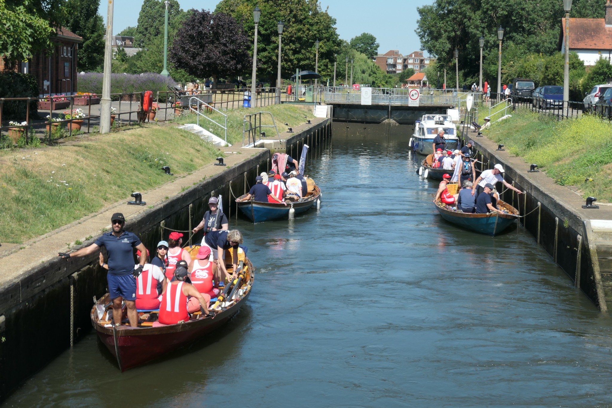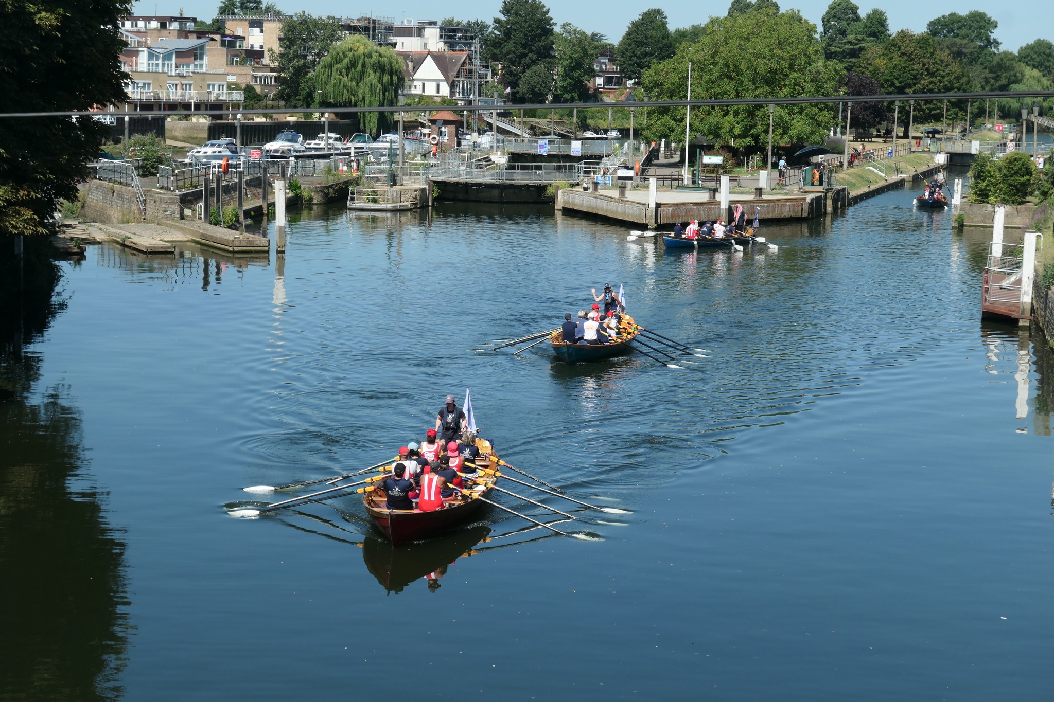 Flags and bunting welcomed the Bellefontains to Richmond before four crews set off upstream to Teddington Lock.